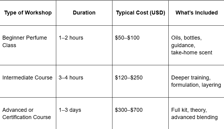 The perfume workshop cost depends on the duration and level of expertise. Here’s a general breakdown: